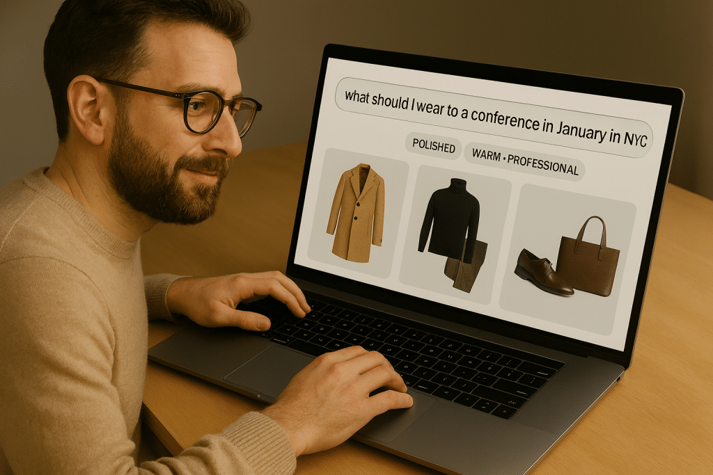 How it differs from classic personalisation. Beyond size/brand/history fit, it prioritises emotion and occasion. A shopper might say: “I need something confident but comfortable for a client meeting in rainy Berlin (12°C).”